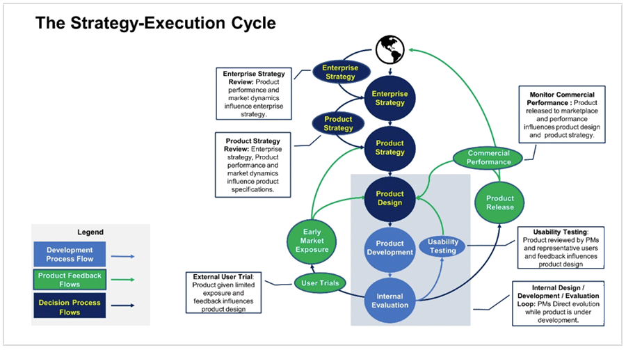 The Strategy-Execution Cycle diagram, below, illustrates the process, interconnections and decision points among the various activities that take place from the time the enterprise identifies an opportunity it would like to pursue (or a threat to which it feels a need to respond) and the time a product makes it into the market.