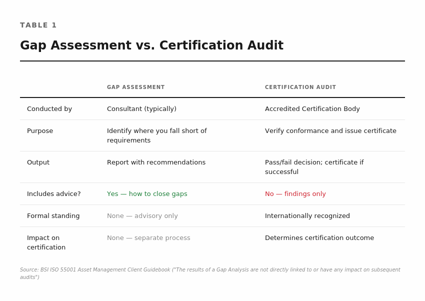A gap assessment and a certification audit might look similar on the surface—both involve someone reviewing your asset management practices against ISO 55001 requirements. But they serve completely different purposes and have very different implications.