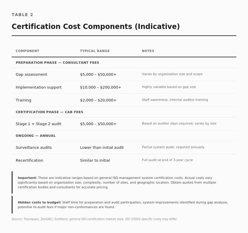 Gap assessment fees from consultants typically range from $5,000 to $50,000 or more, depending on scope. Implementation support—if you need it—can run from $10,000 into the hundreds of thousands for large, complex organizations starting from scratch. Training costs for staff awareness and internal auditor development add another few thousand to $20,000 or more.