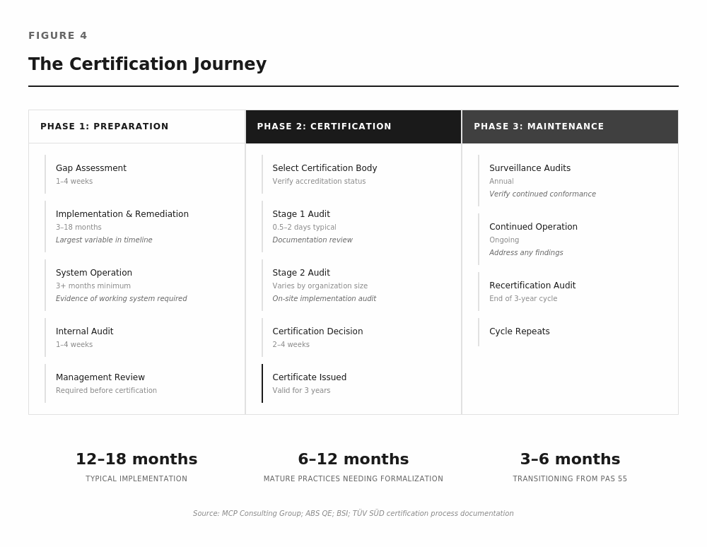 Adding it all up, organizations starting from scratch should realistically plan for twelve to twenty-four months. Those with mature practices needing formalization might achieve certification in six to twelve months. Organizations transitioning from PAS 55 (the predecessor standard) often complete the process in three to six months.