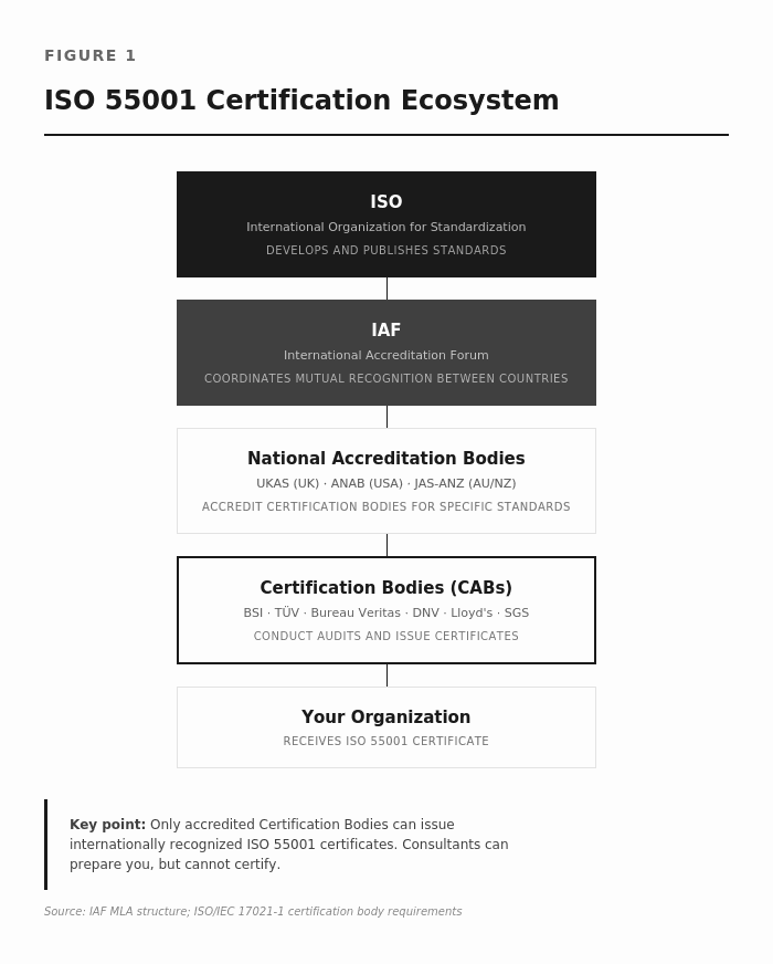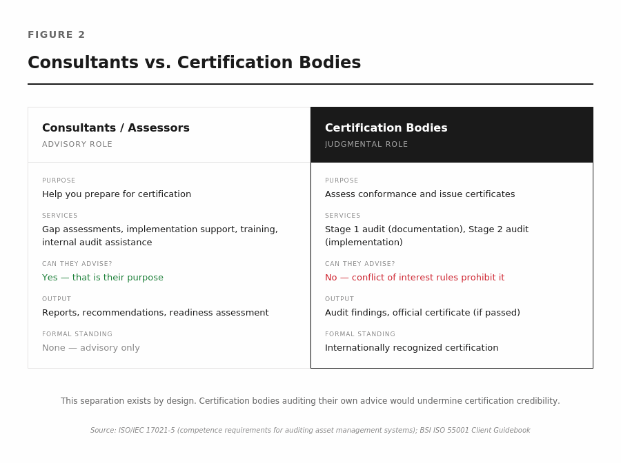 This is why the typical certification journey involves two separate organizations: a consultant to help you prepare, and a certification body to conduct the formal audit. Many organizations actually prefer this arrangement because specialist asset management consultants often have deeper domain expertise than generic CAB auditors, and consultants can give you the hands-on guidance that CABs are prohibited from offering.