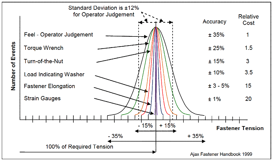 The standard deviation for the “Feel” method is ± 12%. This means if fasteners tightened by ‗Feel‘ are required to be within ± 10% of correct tension (a figured arrived at by the Author on the realisation that those companies he knew that used load indicating washers no longer had fastener problems) then only about 60% of them are within tolerance, with the other 40% having great opportunity to cause problems. It is impossible to guarantee accuracy when tightening fasteners by muscular feel. Using a process that ranges ± 35% to get within ± 10% of a required value is playing a game of chance. Every fastener in the world tightened by “Feel” is at risk.