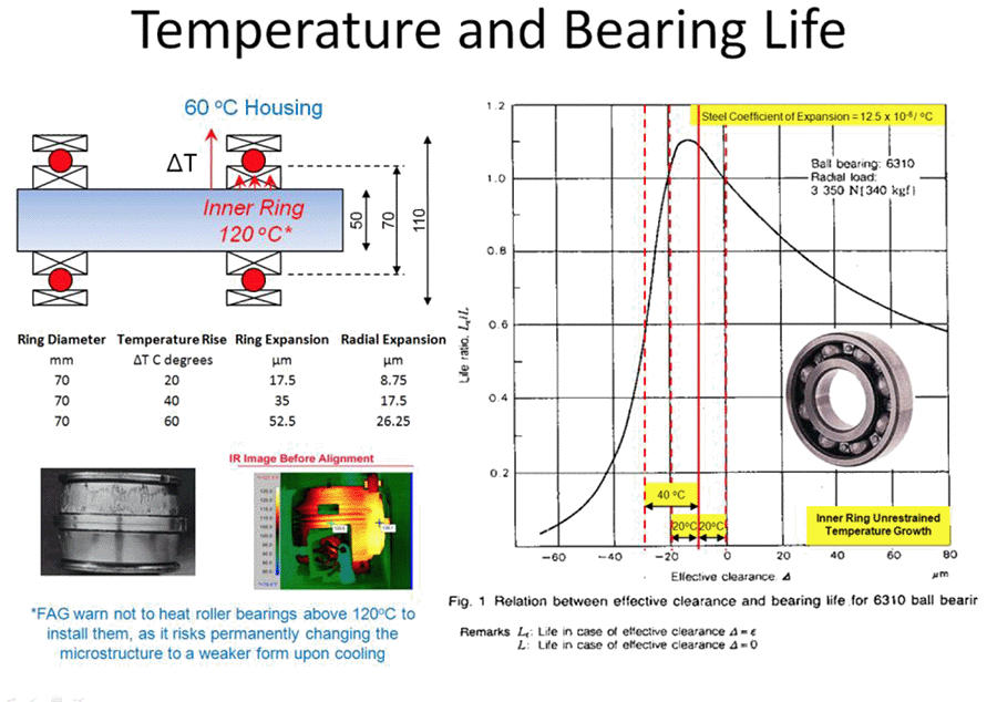 Superimposed over the roller bearing clearance life curve are thermal growth lines showing the change in clearance for each 20 °C difference between inner and outer race. In normal operating conditions, the differential temperature between inner and outer races varies from 5 °C to 10 °C4. But greater temperature differentials are possible when a race is exposed to a large cooling effect or a large heat source, or if it is damaged or run in a way that generates excessive heat. Examples of how that much temperature difference can arise is shown by the misaligned motor thermal image and the spalled race. When the differential temperature between races is substantially hotter than the design intended, the added expansion forces the roller into the race, causing a rapid fall in bearing life. If the temperature differential allows the clearance to expand it also leads to early failure, but less rapidly. A necessary operating condition to get full roller bearing life is to ensure they run at design temperatures and see no unforeseen temperature differentials.