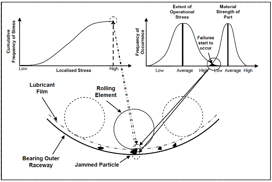 Exceptionally high stresses can be caused by cumulative loading where loads, each individually below the threshold that damages the atomic structure, unite. Such circumstances arise when a light load supported on a jammed particle then combines with additional loads from other stress-raising incidents. These incidents include impact loads from misaligned shafts, tightened clearances from overheated bearings, forces from out-of-balance masses, and sudden operator-induced overload. All these stress events are random. They might happen, or they may not happen, at the same time and place as a contaminant particle is jammed into the surface of a roller. Whether they combine together to produce a sufficiently high stress to create new cracks, or they happen on already damaged locations where lesser loads will continue the damage, are matters of probability.