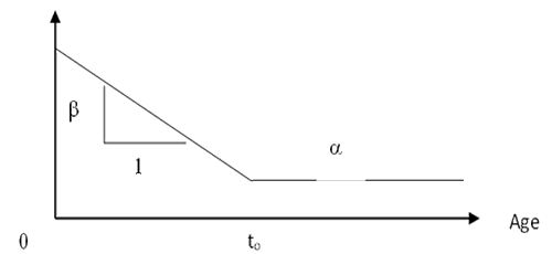 Design of experiments requires a model of the dependent variable as a function of independent variables. Figure 2 shows a linear approximation of a failure rate function that characterizes infant mortality. Independent variables determine the α, β, and to parameters. The linear approximation is a(t) is α+β(to–t) for t< to and a(t) = α thereafter.