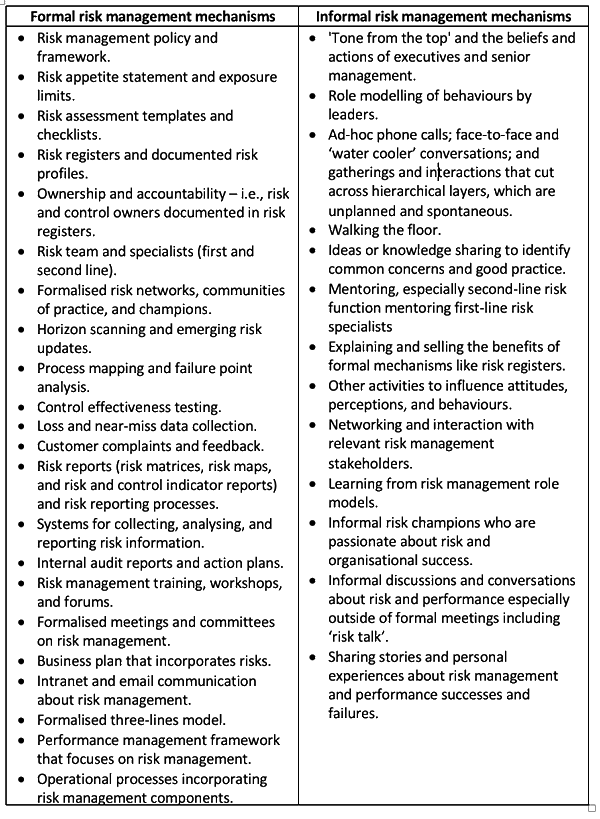 A range of formal and informal risk management mechanisms for organising risk management activities is listed in the table below. (ACCA, 2019)
