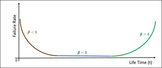 The Beta parameter is highly informative and depending on its value, can provide the analyst with pertinent information on the life characteristics of a population studied. One of the best-known outcomes of the Weibull 2 parameter distribution is the Bathtub Curve. It is a combination of at least 3 Weibull distributions (2 Parameter Weibull) where Beta takes multiple values as shown in Diagram 1 below.