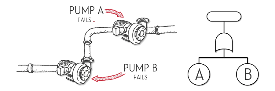 Let’s say we have a simple system that comprises two pumps, but only one pump needs to work for the system to work. In other words, we have ‘redundancy’ in our system. The second or additional pump increases system reliability by taking over when the first pump fails. Those ‘basic events’ in our fault tree are usually circular and represent the failure of a pump. One type of ‘logic gate’ is what we call an ‘AND gate’ and is represented by a shape with a round top and flat bottom. For our two-pump system (with redundancy), the system fails when pump A fails, AND pump B fails. So the fault tree that models the reliability of this system is illustrated below.