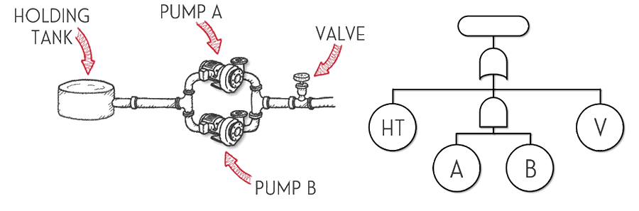 You might notice that there is another type of shape in the fault tree above, which we call the ‘top event.’ No guesses about where the name comes from, but it represents the usually ‘undesirable’ event that we are investigating. In this case, the undesirable event is ‘pump system failure.’