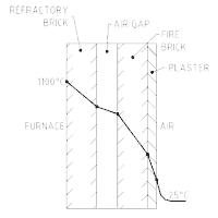 An example of the use of multiple materials to create a thermal resistance is shown in Figure No. 1. It is a cross- section through a furnace wall showing the temperature of the various surfaces that make-up the wall (the temperature gradient). Note that the air gap stops conduction as the main heat transfer mode and makes radiation the dominant mode. If fiberglass batts could be used to fill the air gap, or aluminium metal sheeting hung between the walls, radiation would have greatly reduced and the outside wall temperature would be even lower.