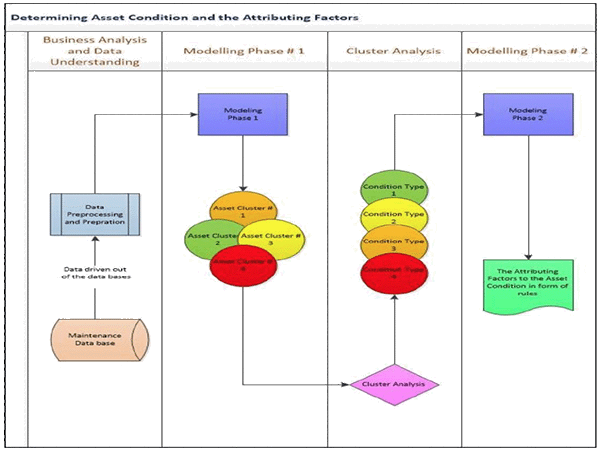 n the next stage, the factors that caused the asset to be placed in each cluster are investigated. Using a whole new set of data mining algorithms all the factors that can cause an asset item to have a certain condition are derived from the data in forms of ‘if-then’ rules. One example of such a rule might be: if a certain Preventive Maintenance (PM) activity is performed more than 10 times, then the asset item ends up in a particular condition (these conditions have been identified and defined).