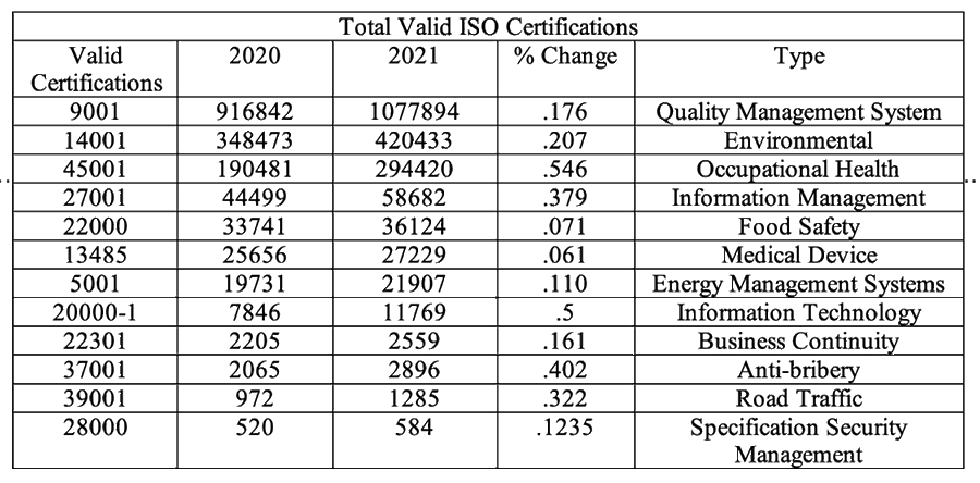 The ISO 2021 valid certification figures show a continued growth in certifications. ISO 9001 is the dominate certification. Thus, any change that ISO makes to this certification will have a substantive impact on the quality profession.