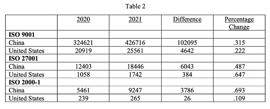 As can be seen, China dwarfs the United States in the number of ISO 9001 certifications. It also has a higher growth rate from 2020 to 2021.