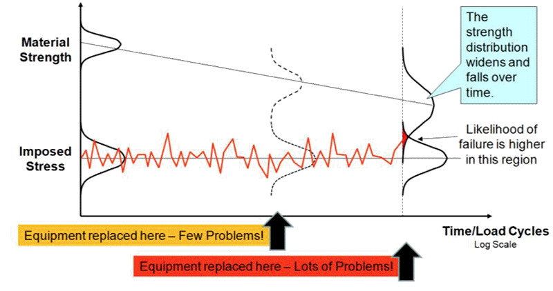 Figure 3 shows the cumulative effect of fatigue over the life of the equipment from imposed stresses. Eventually the structure of the materials-of-construction used in a part fails. If we can prevent distortion of parts so their atomic stress levels are kept far below the values that separate the atomic bonds then the parts will not be failed and our machines will be highly reliable and will remain so.