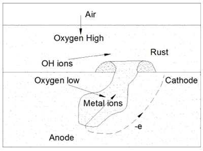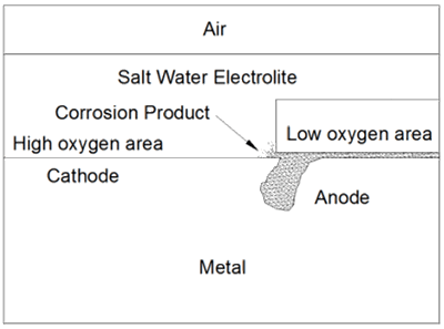 Parts also fail when their atomic matrix is attacked by external elements in their local environment and bonds are removed. Oxygen in the air degrades rubber, hydrogen ions in water cause carbon steels to corrode, such as the pitting and crevice corrosion mechanisms shown in Figures 4 and 5, and aggressive chemicals attack inter-granular phases in alloy metals.
