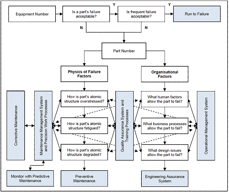 If equipment failure is stopped by preventing equipment parts from failing it is vital that we know what causes each critical part in a machine to fail. A critical part is any component that upon failing prevents the equipment from operating at its minimum service duty. Failure is defined as any unwanted or unsatisfactory behaviour. A breakdown is the end result of a prior failure. To identify what events cause a part to failure we must generate suitable questions related to Physics of Failure causes and Organisational induced causes.