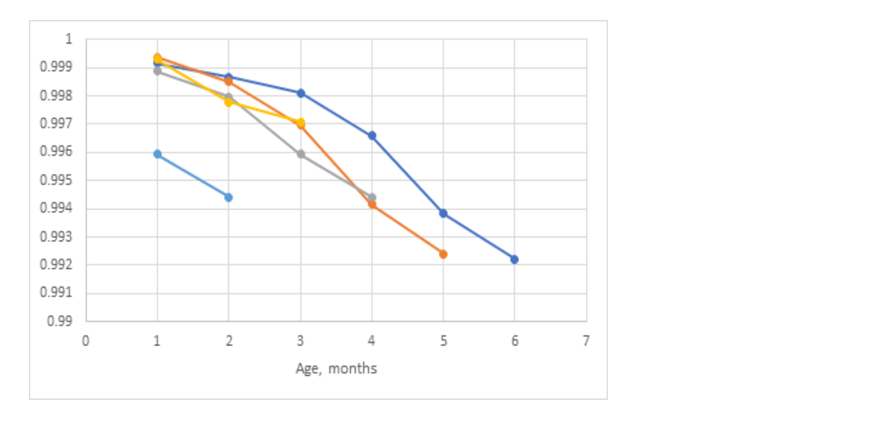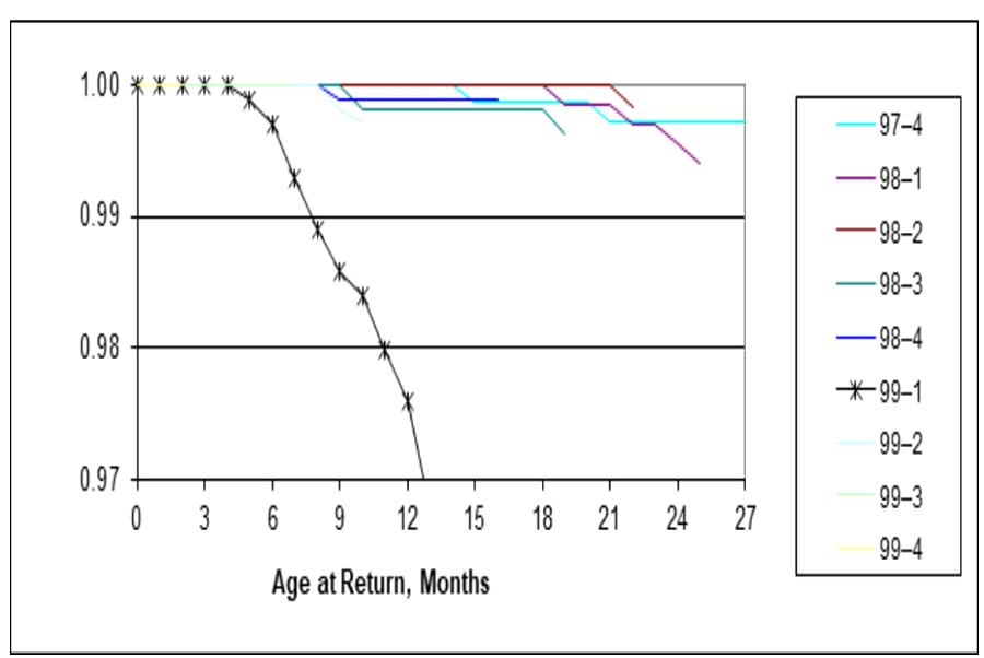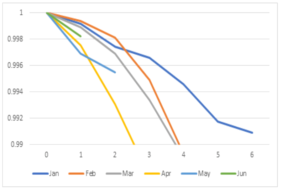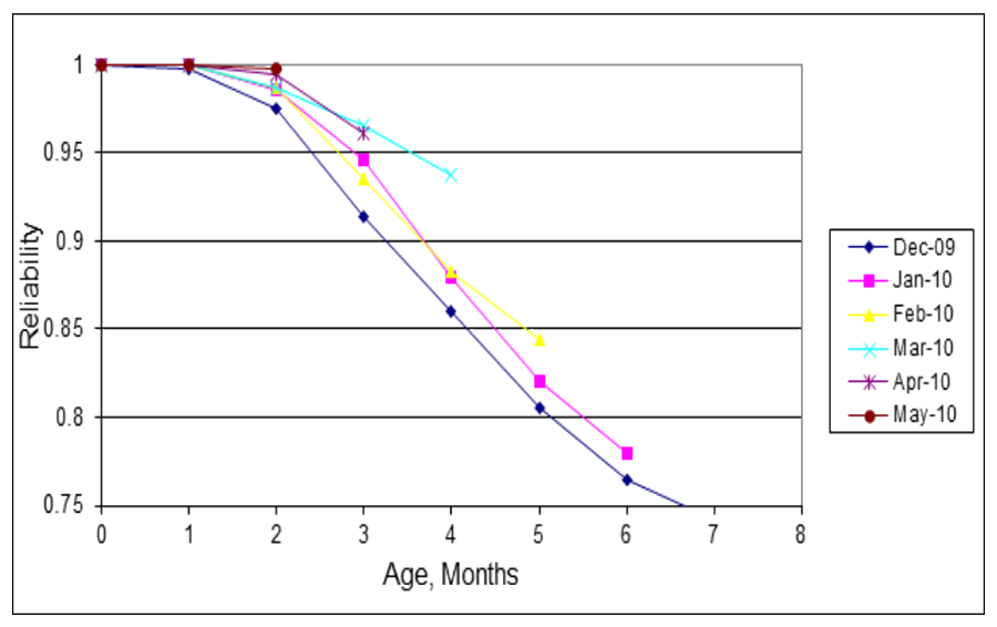 Each line in figure 1 is a nonparametric reliability estimate from each months’ production (cohort). The figure’s legend is cohort production month (7 months of data). Later months’ lines are shorter because there is less data from more recent months. Shorter lines from more recent months’ cohorts appear to be more reliable. That’s because later cohorts’ (shorter lines) are higher than earlier cohorts