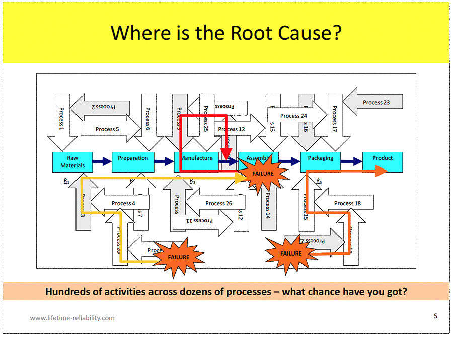 Most importantly the RCFA must force the team to look far wider for contributing causes than human behaviour normally encourages. We all make assumptions based on what we think we know and believe what our limited human senses ‘tell’ us. This is an important reason why a documented RCFA procedure must be followed – to ensure the team does not fall into the trap of taking a blinkered view from the start. The serial natures of our machinery and business process designs mean there will be numerous life-cycle factors to consider; some stretching back to conception.