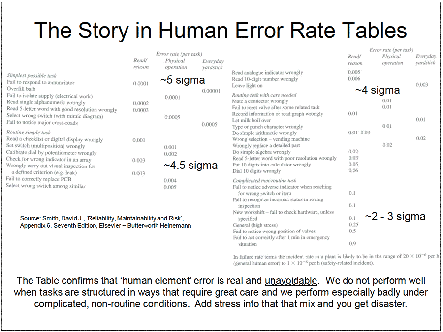 Note the list of task types in the table under the ‘Complicated, non-routine task’ heading. That is where most engineering and maintenance work activities sit; they are complicated technical tasks not done often. Their human error rates are massive – at least one error in every ten opportunities to make an error – and it gets worse when stress is added. Human error is the single biggest reason that companies have poor plant and equipment reliability4. Your plant and equipment are fine; they are failed by poor business processes that allow humans to break them. Machines fail because company managers don’t foresee the effects of human error and human factors and do not protect the company from our inbuilt limitations; thus ensuring failure and disaster will eventually occur.