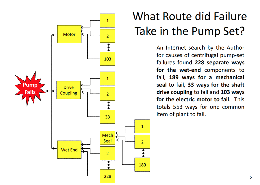 When failures happen, as they inevitably must if people are involved, it is difficult to identify the true cause(s) because many contributing errors will have occurred across the life-cycle of the failed item. In Figure 4 the pump-set fault tree shows that a centrifugal pump can be failed from 553 possible causes. If you did an RCFA on a pump-set breakdown you would have to consider which of the 553 causes occurred to the pump under investigation. Most businesses could never provide the time necessary to conduct that RCFA. Instead, we seek the obvious causes and factors and discard those events considered impossible or too remote to reduce the length of the RCFA. This means that because of process complexity many RCFAs inevitably come-up with the wrong cause and fix the wrong issue, even though we may be convinced that we have found the problem.