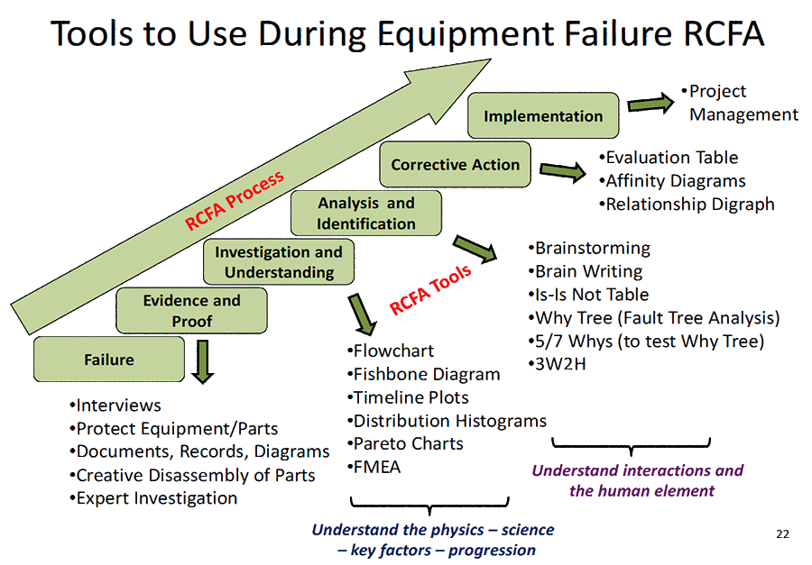 Use well respected investigative and analysis methods when to doing an RCFA. There are many Total Quality Control and Six Sigma techniques that can be applied to analyse events and historic data. Figure 6 indicates some of the common ones easy to use.