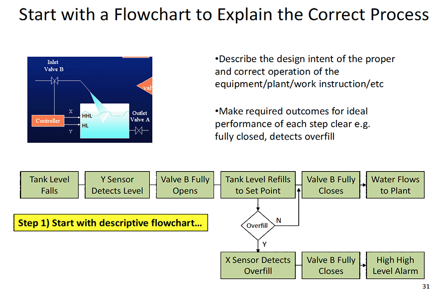 Tools to expand perspectives and de-blinker RCFA team member minds include flow charting the intended design and its behaviour, like that shown in Figure 7 for an overflowing tank and using fishbone diagrams to identify possible influences from various key factors such as measurement, method, machinery, people, materials and environment. These tools are essential for the team to apply at the start if a robust and comprehensive investigation has any chance of occurring.