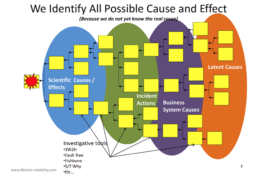 Knowing that the design of our machines and businesses easily lead the RCFA investigation astray, the cause-effect diagram that the team constructs need to have a structure that ‘forces’ them to work from known, indisputable evidence back to what may have occurred at the root(s) of the incident.