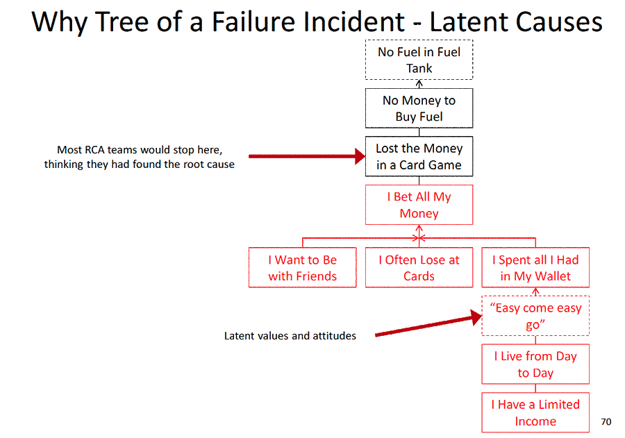 If an indisputable scientific explanation cannot be found the RCFA team should consider stopping because they have only speculation and opinion to work with, which is likely to send the investigation astray and never find the whole truth. Once indisputable physics explains the science of a failure we then try and identify the sequence of physical actions that created the opportunity for failure. Sure, evidence is necessary to confirm our suppositions. The next phase of the fault tree is to find which business systems failed to stop the cascading events. Lastly, we come to latency, which are the inner beliefs, values and norms of the people and organisations involved across the life-cycle of the incident. You may need to go back decades to understand the views and attitudes of people and company culture.