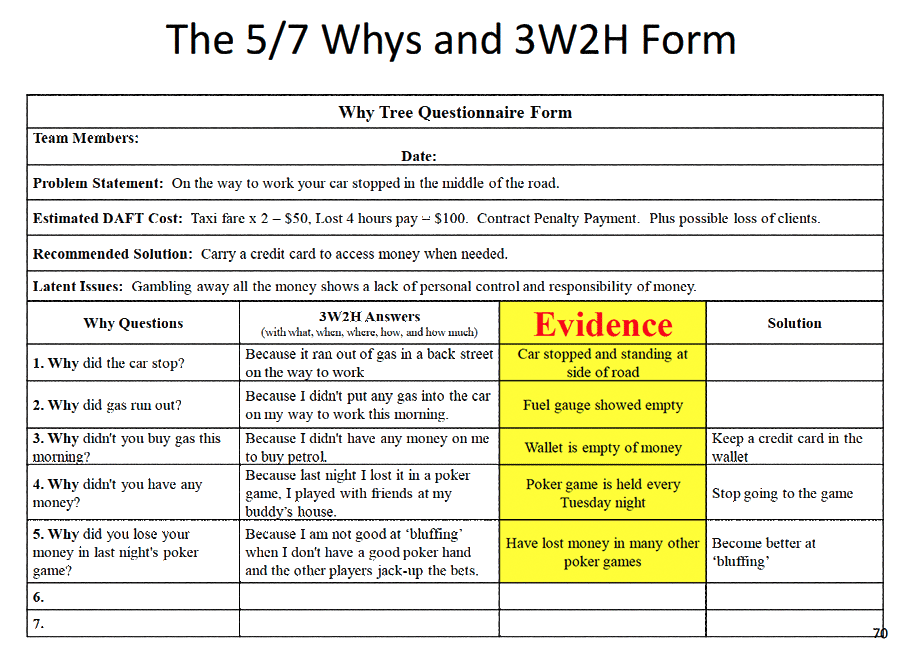 If 5-Why is used, you need to include a means to test each cause-and-effect step and prove the answer to the ‘why’ question with facts. This is the purpose of the 3W2H set of additional questions – With what, When, Where, How, and How much – that need to be used in combination with the 5-Why method.
