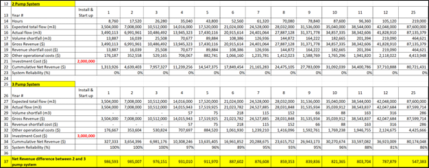 The pumps combined are required to produce a specific output of 400 m3/hr. This output translates into revenue which is the first operational measure of economics. On the other hand, the operation of a pump also comes at a cost including the following:
