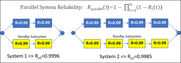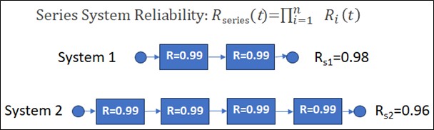 The mathematics is uncompromising. Even though the reliability of subcomponents is high (at 0.99), the more subsystems we have in series, the lower the system reliability (RS1>RS2). In other words, as the number of required in-series elements increases, system reliability decreases even if each element is individually “good.”