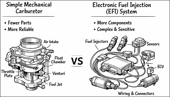 Even though a mechanical carburetor tends to be more reliable in the classic reliability-engineering sense (fewer parts, fewer interfaces, fewer failure modes, and generally easier fault isolation and repair – See Diagram 3), modern fuel and emissions regulations effectively forced the industry toward Electronic Fuel Injection (EFI). The reason is that emissions compliance is fundamentally a control problem. In that regulators require tight, repeatable control of air–fuel ratio across cold starts, altitude changes, transient throttle events, component aging, and a wide range of ambient conditions. The performance a purely mechanical metering device struggles to deliver consistently. EFI achieves this by adding sensors, an ECU (Electronic Control Unit), and actuators (injectors) to measure key variables and continuously correct fueling in closed loop, enabling catalytic converters to operate in their narrow “sweet spot” and keeping pollutants within mandated limits. In practice, this is a deliberate trade: we accept increased system complexity and a larger electronic/connector failure surface in exchange for the precise control needed to meet emissions targets, fuel economy requirements, and on-board diagnostics expectations.