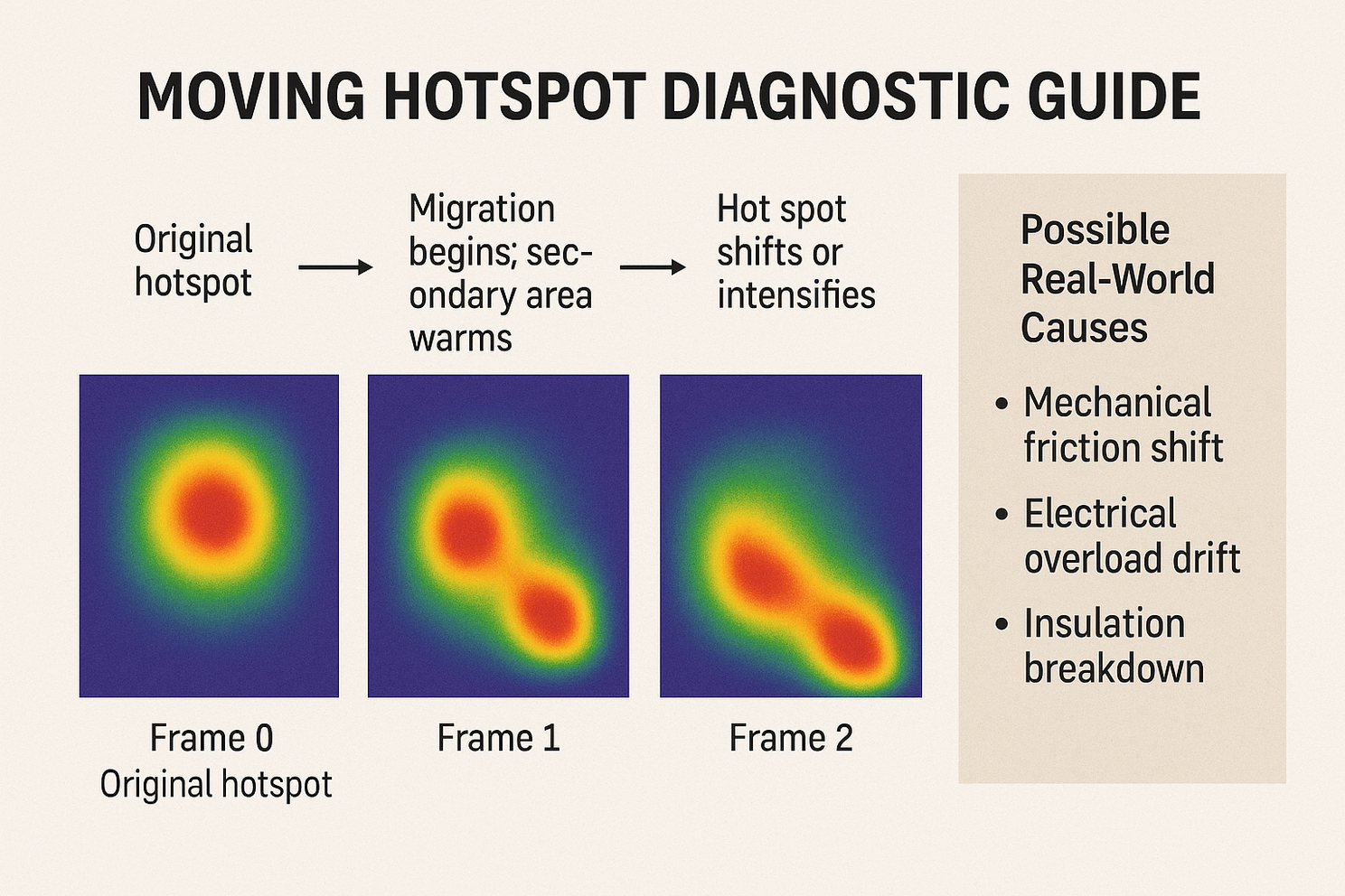 While static hotspots are important, one of the most telling thermal patterns is the migrating hotspot. A condition where heat intensity shifts over time. Unlike a single, stable anomaly, a migrating hotspot reflects dynamic deterioration. It indicates that the problem is not stationary, but evolving either mechanically, electrically, or thermally.