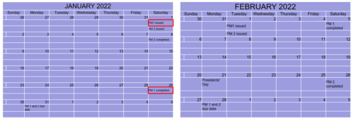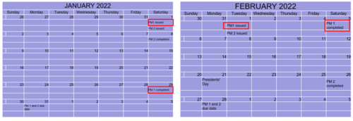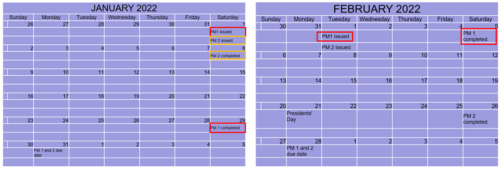 - In February PM2 is issued on first day of month with a due date of January 31st. The PM is completed on the 26th of the month, 25 Days after being issued.