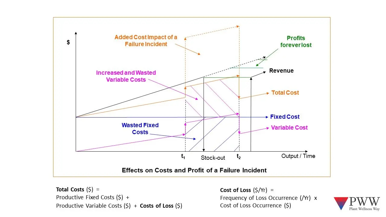 From the moment of failure to the restart of production, no saleable product is made. Instead, money is spent on repairs, with continued fixed costs, and any potential profits that could have been made from saleable products is lost. The graph below illustrates what happens to production time and costs when operations stop due to equipment breakdown (t1). The time and costs required to repair the equipment to operational levels (t2) is unknown at the start of the breakdown.