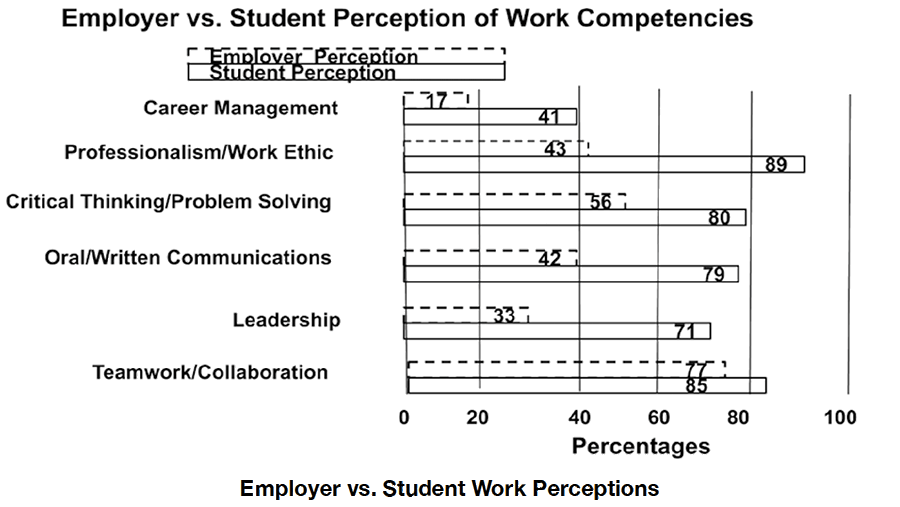 Story: The table below reveals the Employer (top bar) vs. Student (bottom bar) perceptions of work competencies including career management, professionalism, critical thinking, written communications, leadership, and teamwork.61 The figure explains why many of today’s university graduates are unemployed and underemployed.