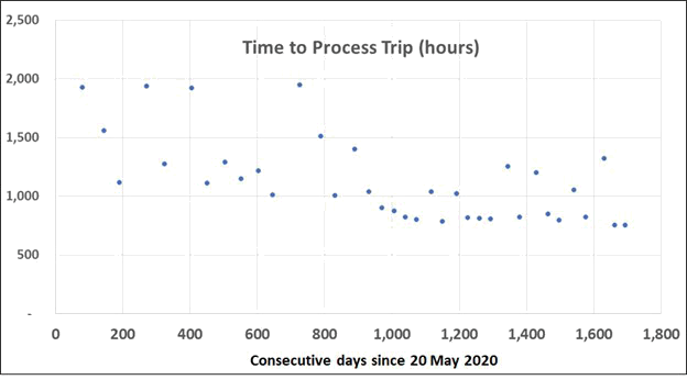 A basic example of this concept is provided below. Process trips or interrupts were recorded during a specific time interval; from years 2020 to 2025. Those trips occurred following a process overload or component failure. They were concerning to management as they caused stoppages in production leading to downtime, output reduction and potential safety issues. However, initial higher trip intervals were deemed acceptable to management, but later trips increased in frequency causing concern. The time to failure was reduced as shown in the right-hand section of Graph 1 below. Subsequently, a Root Cause Analysis exercise was initiated.