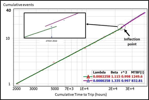 In practical terms, the Crow-AMSAA technique involves plotting, cumulative failures vs cumulative time on a log-log scale resulting in straight line plots (2). The line slope value (or Beta value) indicates improving, deteriorating, or constant failure occurrences. Due to the straight-line nature of the plots, future failure forecasts can be estimated. In plain words, based on the current trend, when is the next failure expected to occur? This method handles mixed failure modes, so it is, therefore, suitable for the complex nature of the generating units.